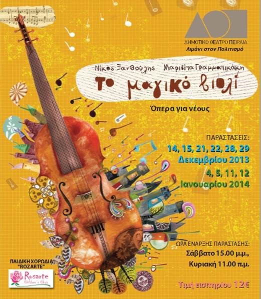 "Το μαγικό βιολί", είναι ένα μουσικό παραμύθι που αποκαλύπτει την δύναμη της μουσικής και της αγάπης. Μια ιστορία που γεννήθηκε από ένα παιχνίδι της λέξης όπερα και δημιούργησε τους πέντε ήρωες. Τον βασιλιά Οράτιο, τον υπηρέτη Πρόκα τον τρελό της πολιτείας Έντυ, την κόρη του βασιλιά Ρόζα και τον τσιγγάνο μουσικό Αμίρ.