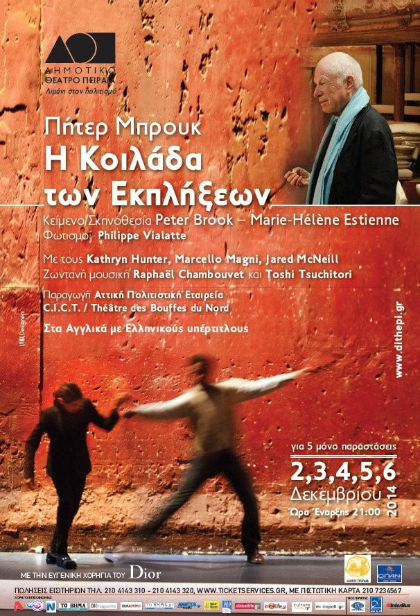 Ο σπουδαιότερος σήμερα Ευρωπαίος σκηνοθέτης, ο Βρετανός Peter Brook, παρουσιάζει στο Δημοτικό Θέατρο Πειραιά σε συνεργασία με την Αττική Πολιτιστική Εταιρία και για πέντε μόνο παραστάσεις από τις 2 Δεκεμβρίου, το έργο του «Η Κοιλάδα των εκπλήξεων» σε δική του σκηνοθεσία και της Marie-Hélène Estienne