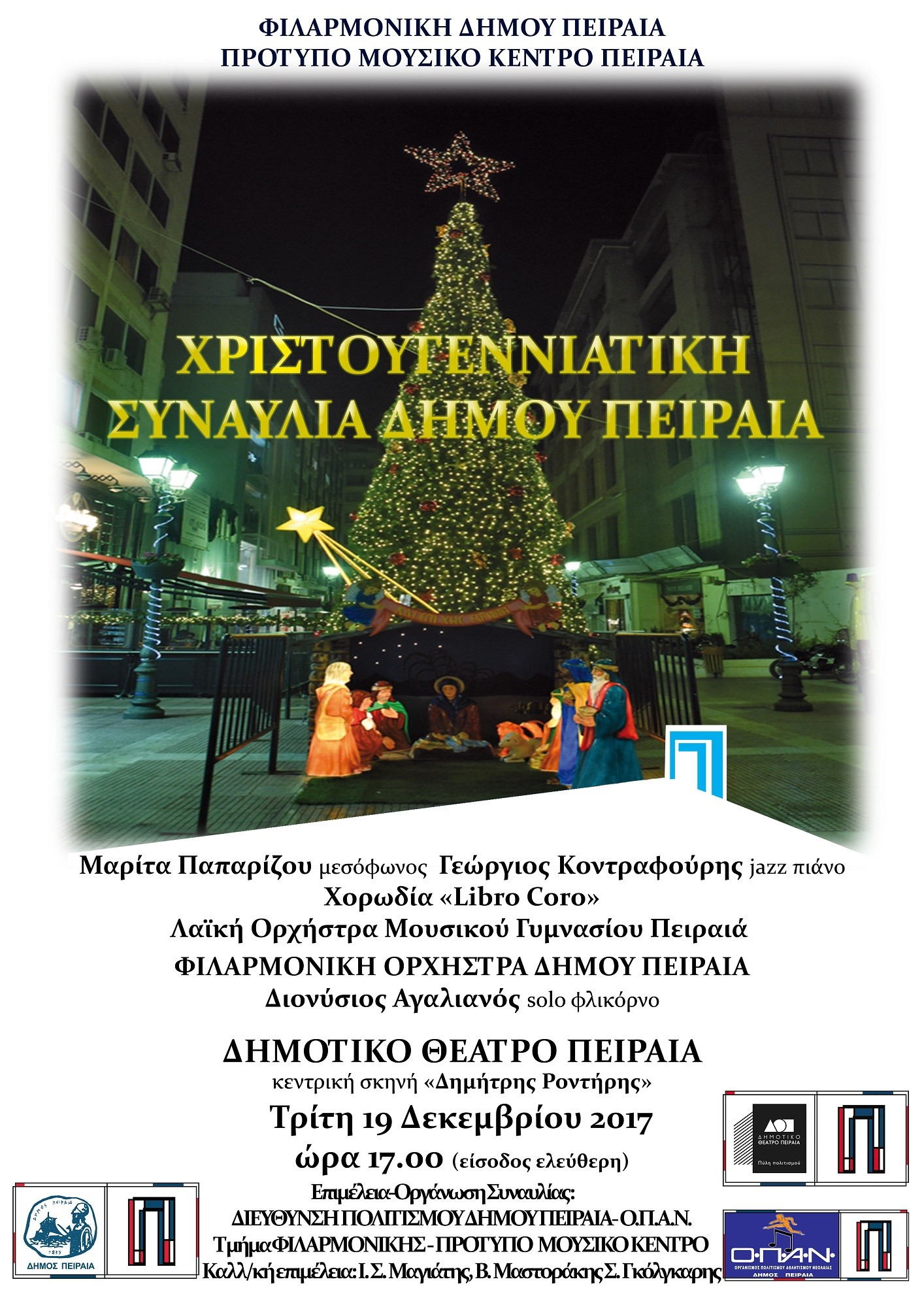 Η Φιλαρμονική Ορχήστρα Πνευστών του Δήμου Πειραιά και τo Πρότυπο Μουσικό Κέντρο, σε συνεργασία με το Μουσικό Σχολείο Πειραιά και την χορωδία Libro Coro καλωσορίζουν τα Χριστούγεννα στις 19 Δεκεμβρίου με μια μεγάλη εορταστική συναυλία που θα πραγματοποιηθεί στη κεντρική σκηνή «Δημήτρης Ροντήρης» του Δημοτικού Θεάτρου Πειραιά.